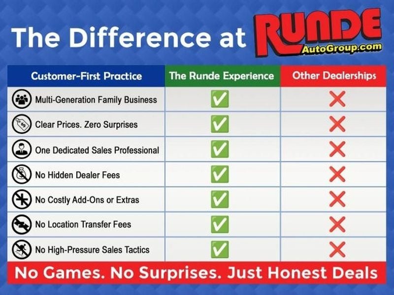 : It is the responsibility of the buyer to address any and all differences between information on this page and the actual vehicle and/or any warranties offered PRIOR TO THE SALE OF THIS VEHICLE. Data on this page is compiled from publicly available sources believed by the publisher to be reliable. The publisher assumes no responsibility for errors and/or omissions in the compilation of this data, and makes no representations, expressed or implied, to any actual or prospective purchaser of this vehicle as to the condition of the vehicle, ownership, vehicle history, listed equipment/accessories, price or warranties. Fuel economy estimates are for newly manufactured vehicles. Actual fuel economy may vary with driving conditions, vehicle conditions, and vehicle age. See dealer for details. At Runde's, we have no doc. or prep fees ever!